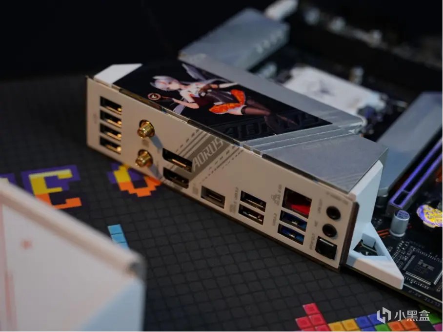 再来看主板的I/O接口,从上往下看,依次为黑色的USB2.0接口四个、WiFi天线接口,并排的HDMI接口和DP接口、速度达20Gbps的Type-C接口、红+蓝色的USB 3.2 Gen 2接口(5Gbps)、2.5G网络接口以及音频接口,全面兼顾数量与速度。
