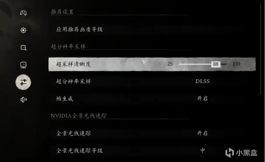画质设置方面,分辨率设置为2K,DLSS设置为88,打开帧生成,光追档位中,画质全设置为影视级。