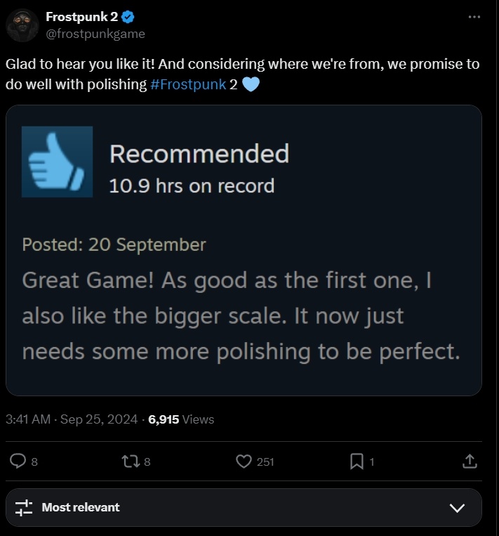 對此,11 bit studios今天在X上答覆稱:“很高興聽到你喜歡《冰汽時代2》!我們承諾,一定會在接下來不斷潤色以使得遊戲臻於至善。”