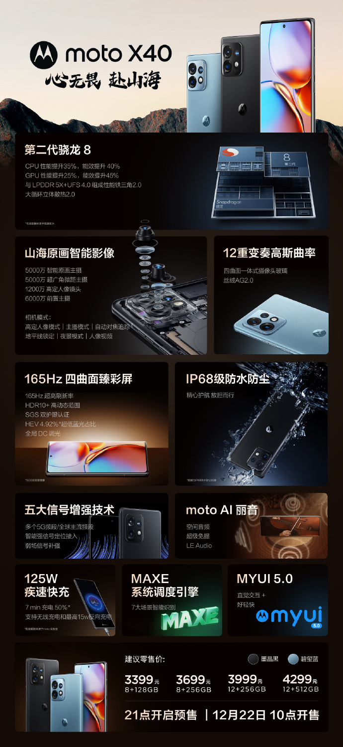 IT之家了解到,摩托罗拉 moto X40 今晚开启预约,12 月 22 日开售,售价为: