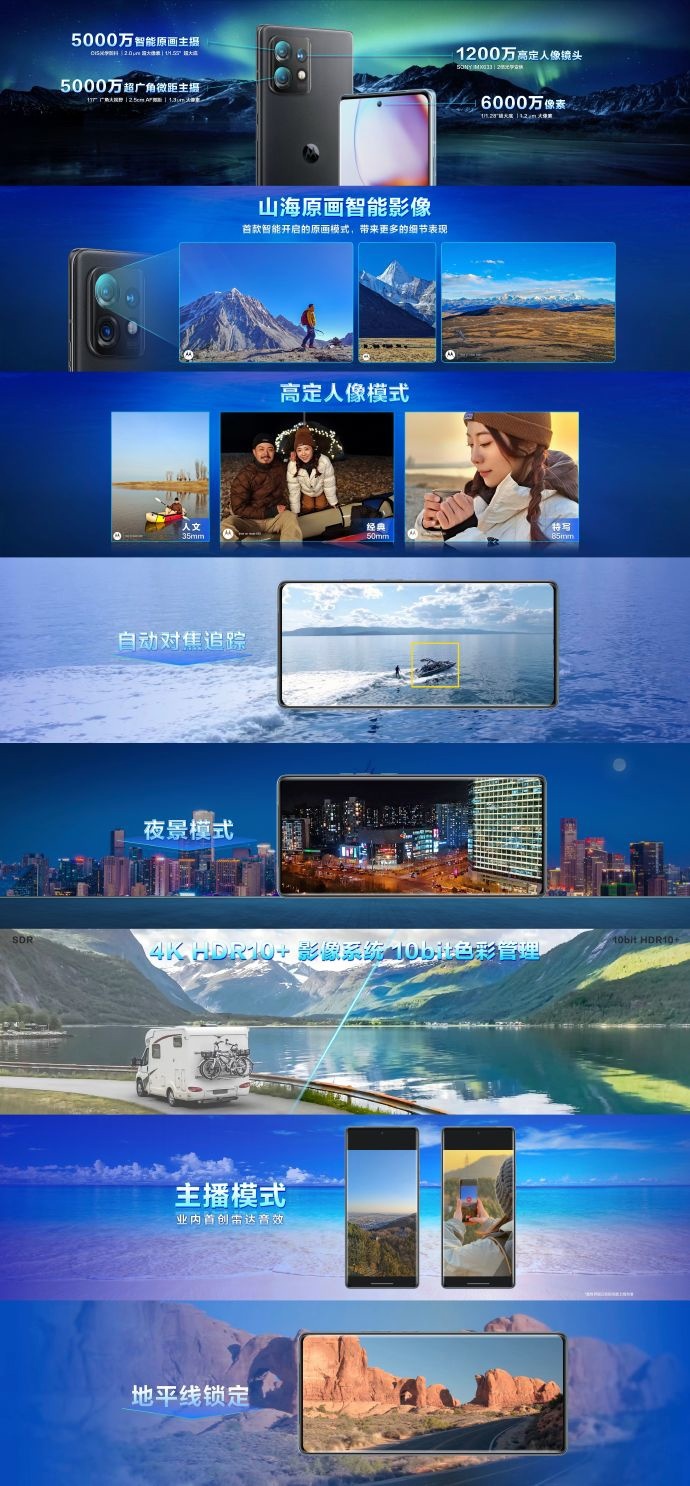 moto X40 前置 60MP 居中挖孔镜头,后置 50MP 主摄 + 50MP 超广角微距 +12MP 人像长焦镜头,支持高定人像模式、自动对焦追踪、夜景模式、地平线锁定,搭载 4K HDR10 + 影像系统和 10bit 色彩管理。