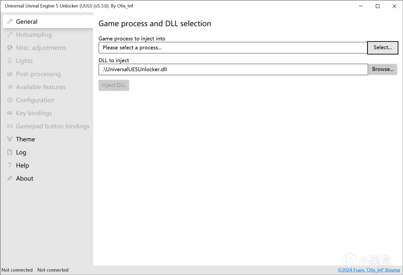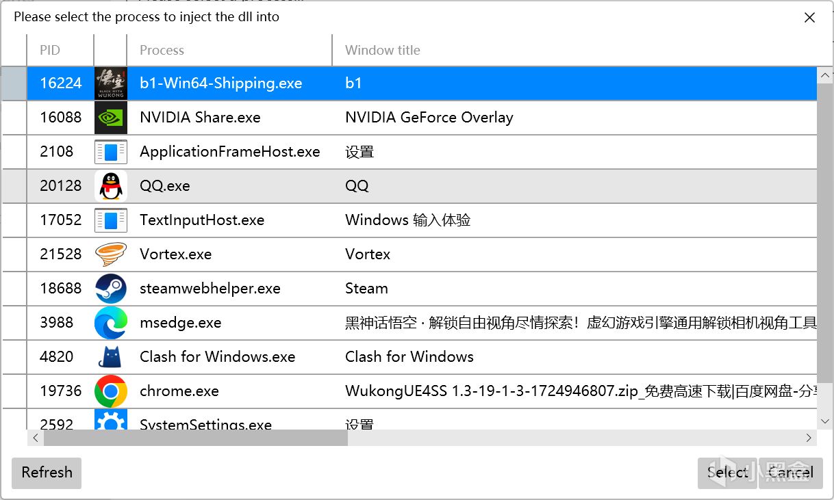 9.进入游戏后,点开那个虚幻5工具,点击slect选择黑神话悟空。然后点击inject dll
