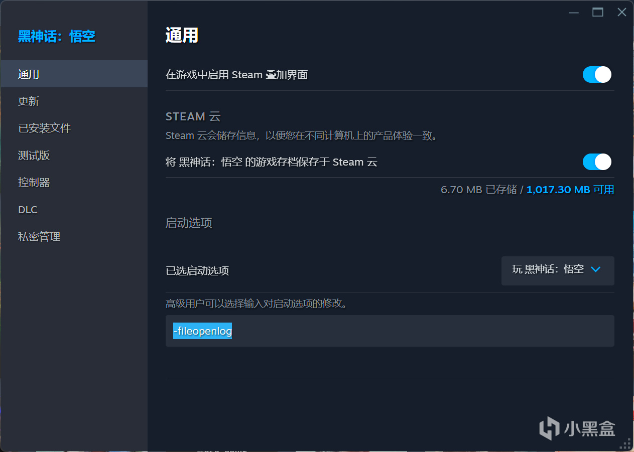 7.在steam里右击黑神话悟空,选择属性,在高级用户启动项里输入-fileopenlog