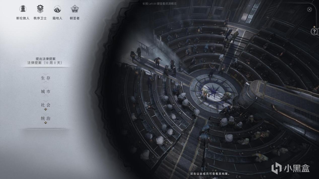 那么议会人员有哪些呢?基本派系有霜地人、新伦敦人、守誓人和进步派。每个派系都有不同的地方,例如我们平时最容易理解的激进派和保守派。激进派只讲科学,不讲伦理、信奉适者生存。保守派则是丰富感情,讲究人文,但是优柔寡断。一开始对全社会有益的提案会被无条件通过,但是,随着剧情的推进,一些条案可能会损失一方的利益。所以为了让条例通过,我们需要争取一些派系的支持,我们还可以贿赂他们。例如下次支持和通过他们想要的法案条例。