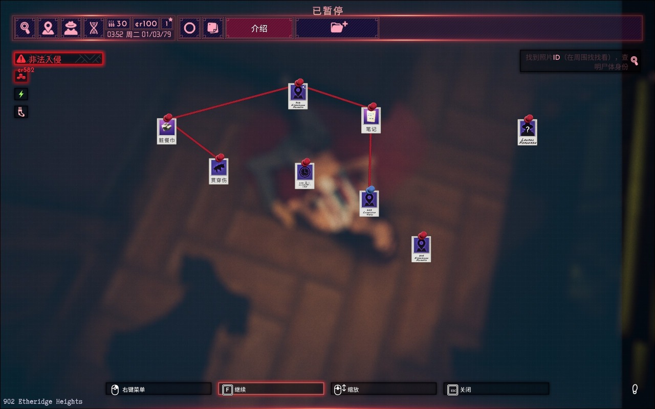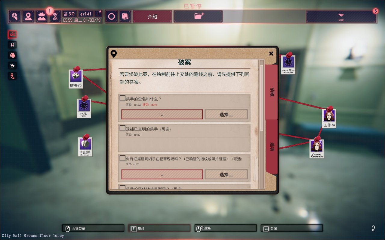 等你搜集完了線索以後,還要把它們一一排列在線索板上,像警察一樣通過紅線把各個線索連接,嘗試找出它們之間的關聯,繼而挖掘出更深入的線索。儘管流程相當自由,不過製作組還是通過了一個「偵破報告」來對玩家的流程進行把控,換言之只要你能解決這些目標,方法什麼的沒人在意——前提是先保住自己的小命。