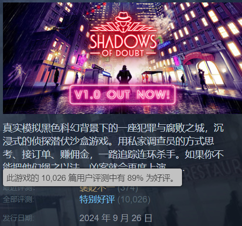 那麼問題來了,Steam上有沒有更加硬核的推理遊戲呢?顯然也是有的:評價人數1W+、好評率90%+的《兇影疑雲》。我可以很負責任地說,這絕對是你能見到的最硬核的推理作品,硬核到操作上甚至有些不夠人性化,以至於阻礙了很多輕度玩家想要嘗試的念頭。