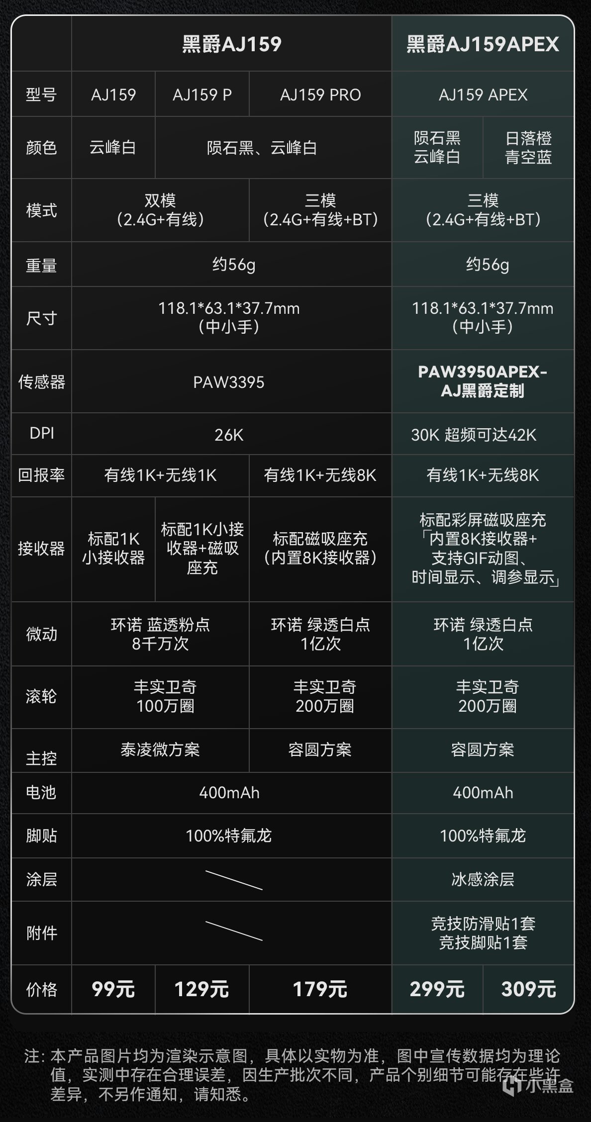 首先就是AJ159系列的各个版本,目前有AJ159、AJ159P、AJ159PRO、AJ159APEX以及新出的一款仅需89元的AJ159MC,外观模具统统都是一样的,主要是传感器、主控方案、连接方式以及微动滚轮方面存在差异,除去这些还有一些不同,具体配置都可以看下面的这张表,其中没有显示的MC版本采用的传感器是原相3338.