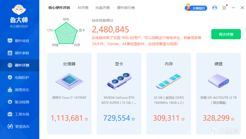 小主机虽然小巧,但是性能相当不错,鲁大师综合跑分达到了250W的水准。