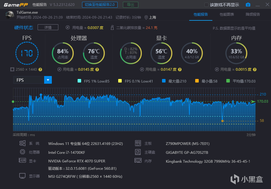 PUBG的游戏平均帧率为170 FPS,1%low帧为85 FPS,游戏体验极致流畅。