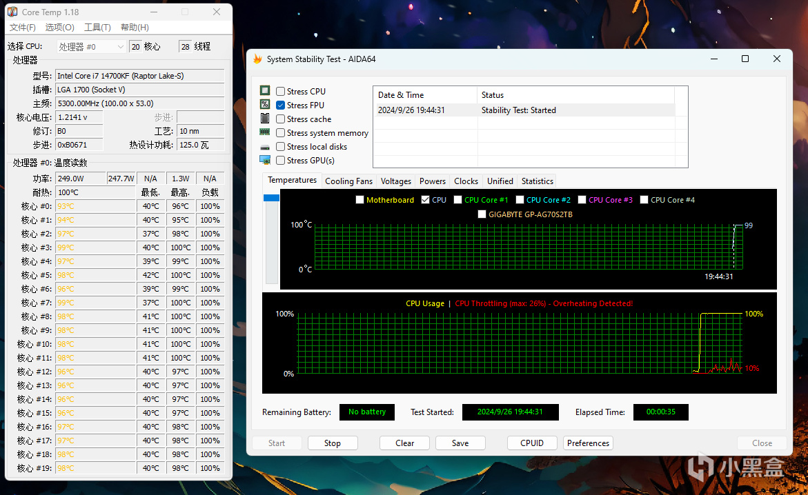 在不进行任何优化的情况下,开启FPU烤机,14700KF的功耗达到了249W,温度99℃撞墙后,核心功率降频到4.8G。