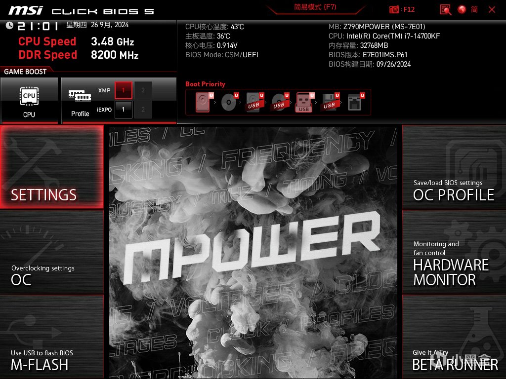 这次主板选择的是目前最炙手可热的微星Z790MPOWER,它专注于内存超频能力,能实现8000MHz+的标称值。