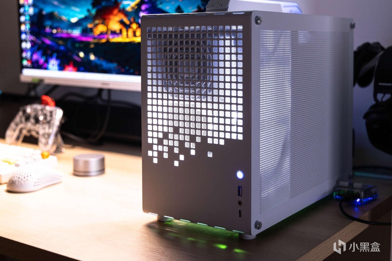 机箱正面采用大面积的栅格设计,提供了电源键,USB,TYPE-C和3.5mm音频接口,内置同色成色防尘网,极具工业美学的同时也保证了前置电源的散热。