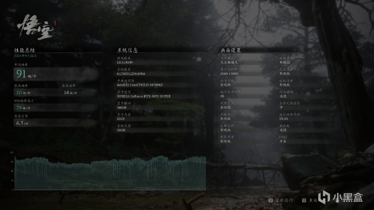 游戏表现方面,目前最热门的《黑神话悟空》游戏基准测试,开启影视级画质,开启DLSS 3.0,2K分辨率下,游戏平均帧数可以达到91帧/秒。
