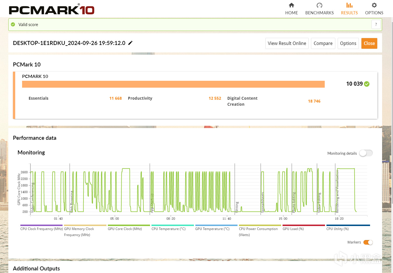 PC Mark Extended整机测试,整机得分10039分,常用基本功能测试得分11668分,生产力得分12552分,数码内容创作得分18746分。