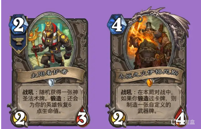 泰坦諸神版本的另一個關鍵詞是鍛造,帶有鍛造關鍵詞的卡牌可以花費2費來對其進行升級,大部分鍛造牌鍛造後都能獲得額外的效果,而鍛造這個機制的操作方式和可交易牌一樣,都是拖到牌庫上方,到時候會出現一把錘子錘一下卡牌,就代表鍛造完成了。和鍛造牌一起推出的還有永恆之火伊格尼斯,當你在本局對戰中鍛造過一次,就能夠讓伊格尼斯爲你打造一把武器,有點像當年的卡扎庫斯,都是先選擇費用,然後選擇一個關鍵詞再選擇一個特殊效果,而這張卡因爲能造出1費風怒刀,也誕生了很多OTK卡組。