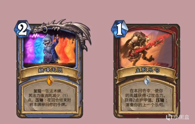 傳奇音樂節版本的關鍵詞是“壓軸”,當你打出帶有“壓軸”關鍵詞的卡牌時,正好消耗掉剩餘的法力水晶的話就能夠觸發額外效果,需要注意的是,只要打出卡牌後法水晶歸零就行了,並不需要是最後一張牌,甚至可以打出硬幣然後打出1費壓軸牌再壓一次軸。而這個壓軸關鍵詞還有個出圈的梗,就是“彈個riff”,戰士在這個版本獲得了三張riff(樂句)卡,每張壓軸效果都是彈奏你的上一狀態,剛出的時候因爲強度實在太低了,而且當時戰士一直都在墊底,導致被大夥當梗嘲笑了一陣子,不過經過加強後,現在的riff卡已經還不錯了,在後續的某個卡組裏,戰士還可以彈着樂句把人斬了。另一個就是牧師的專屬關鍵詞:過量治療,顧名思義就是治療溢出的時候能夠觸發效果