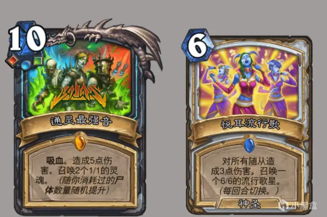 另外音樂節版本每個職業的兩張橙卡都是傳奇樂師+他的成名金曲,而成名金曲是以傳說法術的形式登場的,而每個職業都代表了不同的歌曲風格,比如死亡騎士對應死亡重金屬,聖騎士玩起迪斯科,戰士和DH則是不同風格的搖滾。死亡騎士的成名金曲是通靈最強音,他是死騎首張三色混色的卡牌,從此設計師開始對這種彩虹DK孜孜不倦的進行補強。另外音樂節版本里還有一些法術在手牌裏每回合都會切換風格,稱之爲“悅耳/刺耳音樂”,有點像當年女巫森林裏狼人的卡牌機制。