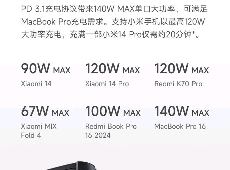 该充电宝的最大亮点在于其强大的充电能力。它支持最大单口功率为140W,甚至能为小米手机提供最高120W的功率充电。更令人惊喜的是,它可以同时为三台设备充电,分别提供65W、27W和最高120W的充电功率。在双口同充模式下,功率更是可以达到65W+120W,充分满足了用户多设备同时充电的需求。