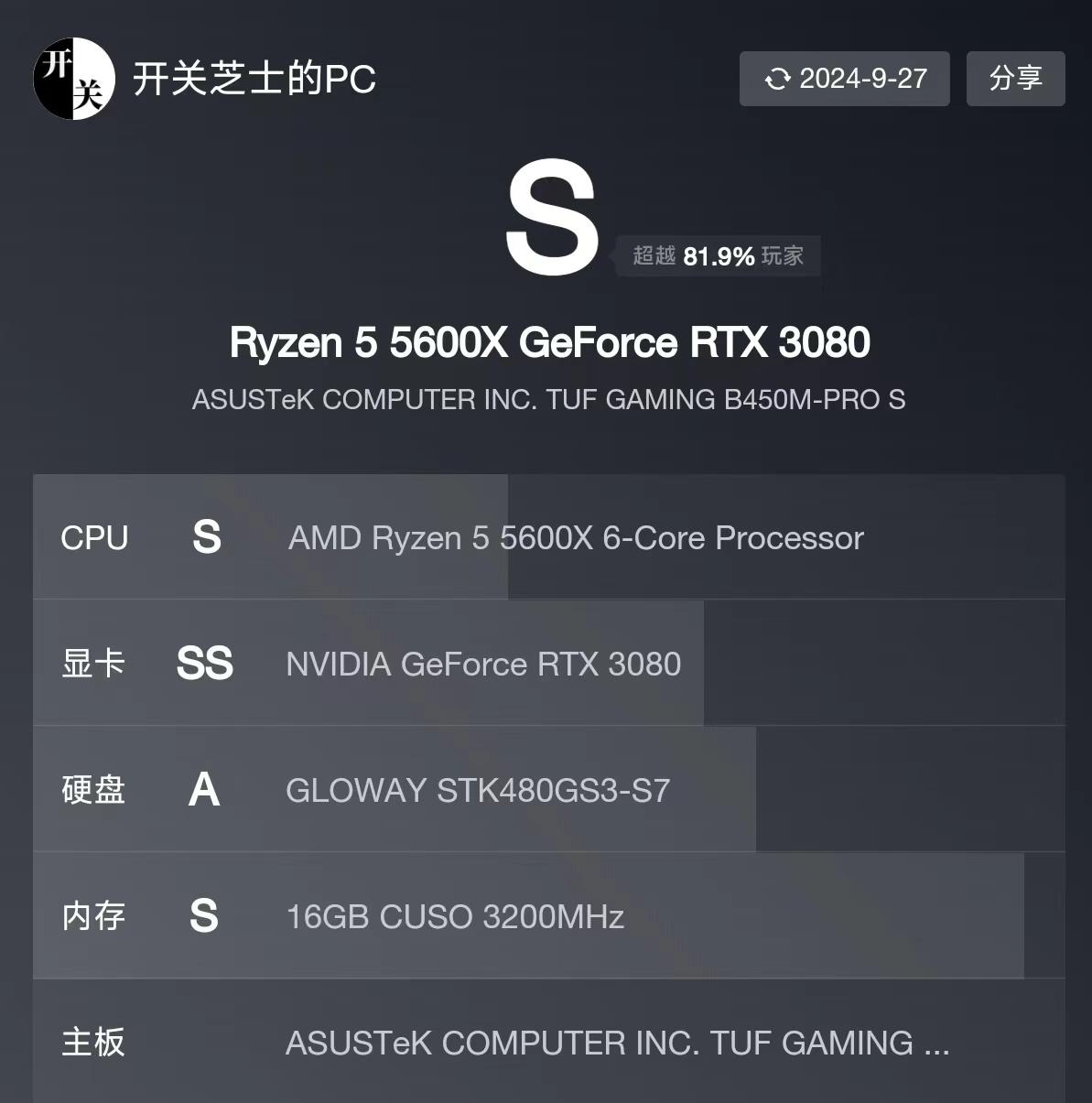 說句題外話、我自己電腦是兩年前配的R5 5600X+RTX3080+3200Mhz 8G*2: