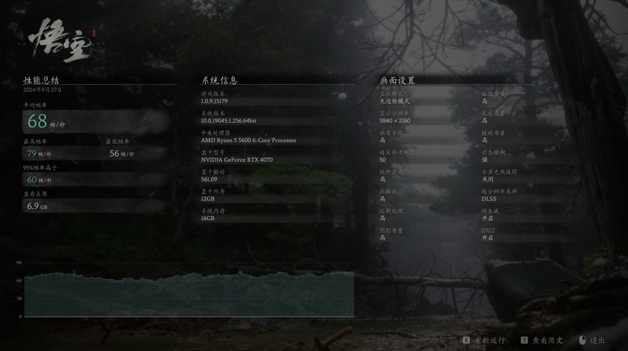 接下來就實測下、看這套配置4K分辨率性能如何!首先上《黑神話 悟空》,4K高畫質預設下,平均幀68: