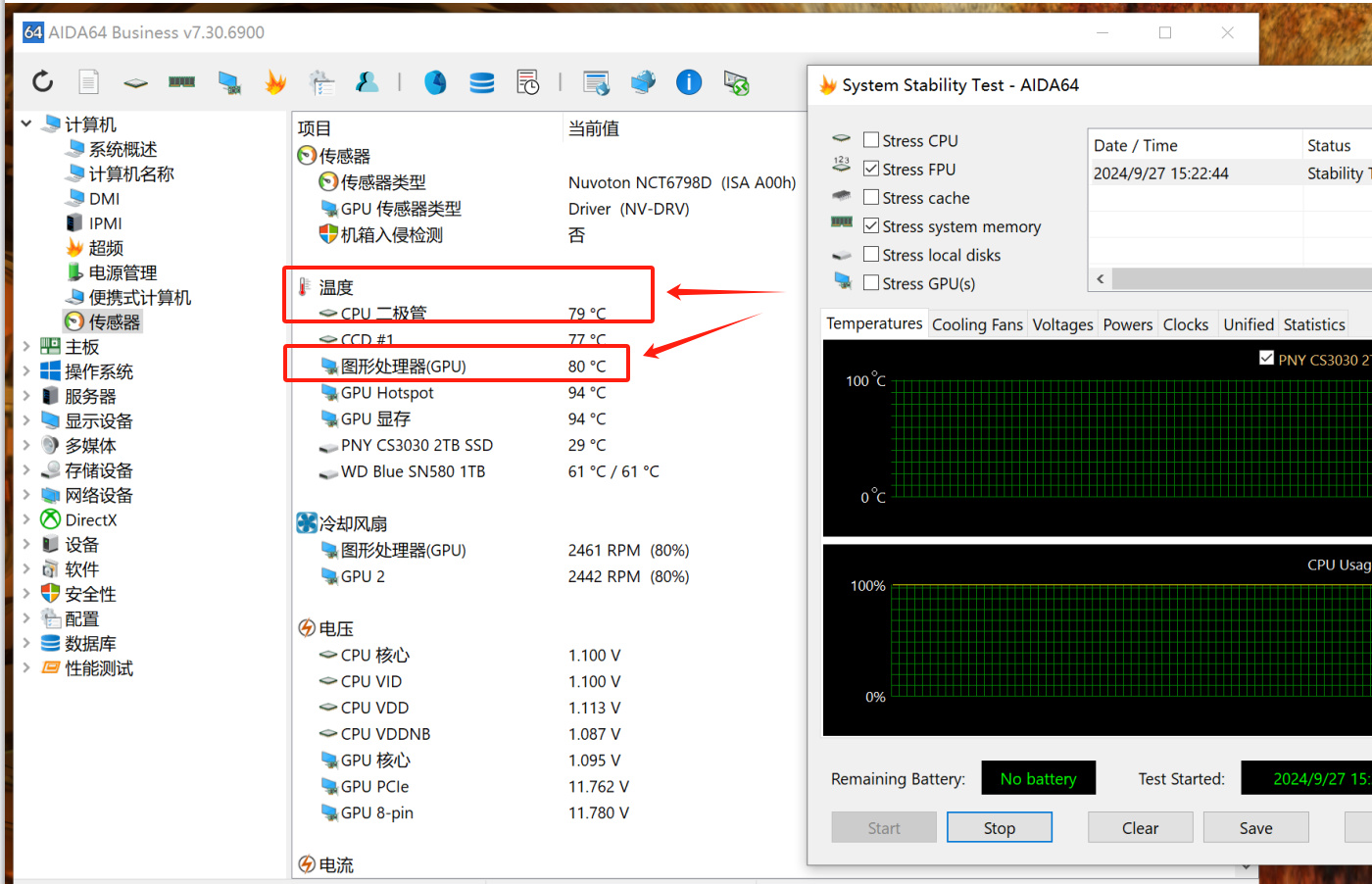 全封閉環境下,極限4K甜甜圈+FPU雙烤測試時,CPU溫度穩定在79°C;顯卡穩定在80°C