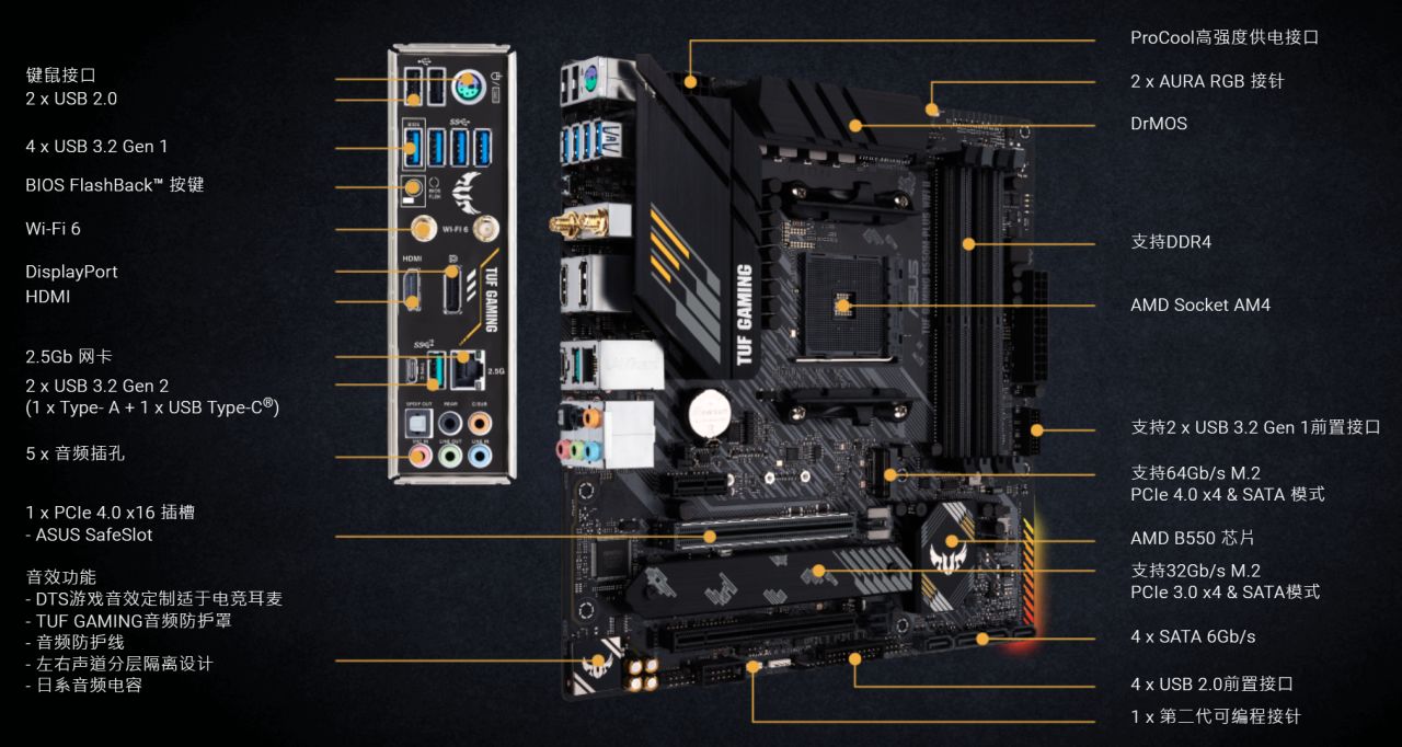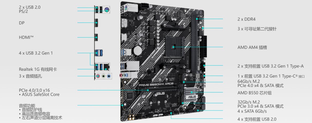 老面孔華碩B550M-K ARGB,雙M2硬盤接口,支持ARGB和前置TYPE-C: