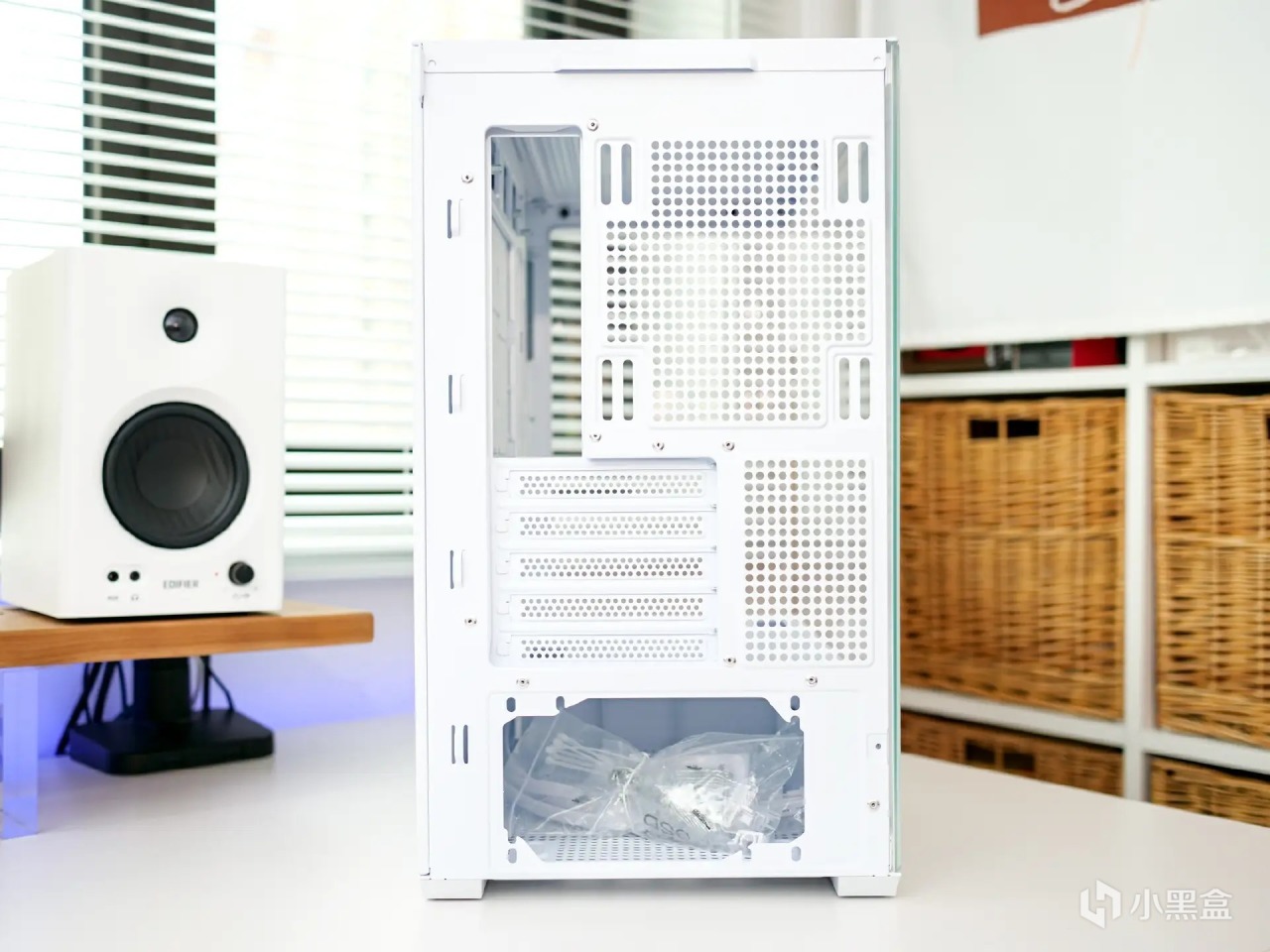從機箱背部可以看出內部分區結構,電源下置,並且提供了5槽位PCIe的空間,對於MATX主板來說是滿配了。另外機箱背部左側還預留了一排理線固線孔,算是機箱中少見的設計。