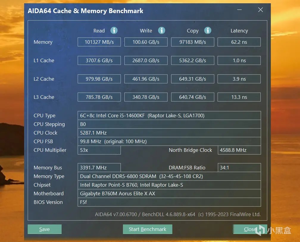 XMP6800頻率下,宏碁掠奪者Hera 6800內存AIDA64測試成績: