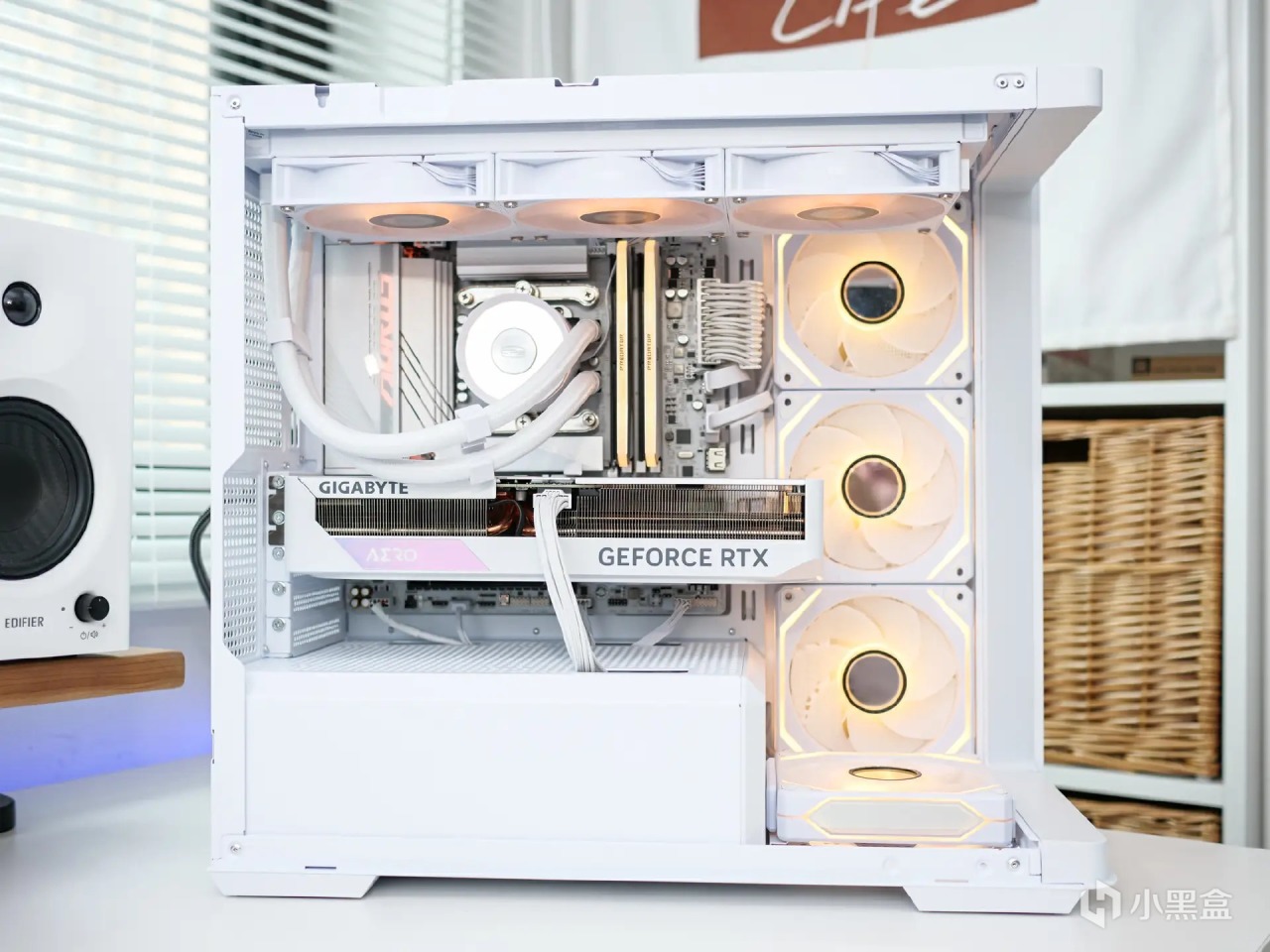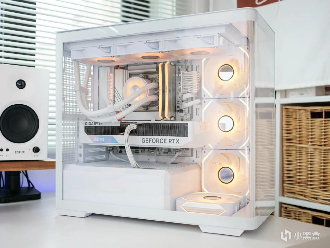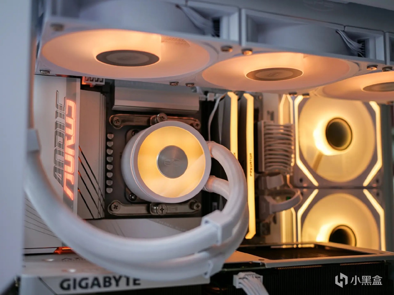 整機主打高性能純白高顏海景房,因此主板、顯卡、內存、水冷等能看到的裝機配件選擇都是白色,並且也選擇了支持ARGB燈效的積木風扇做裝飾,可以通過技嘉主板的GCC軟件進行燈光同步。