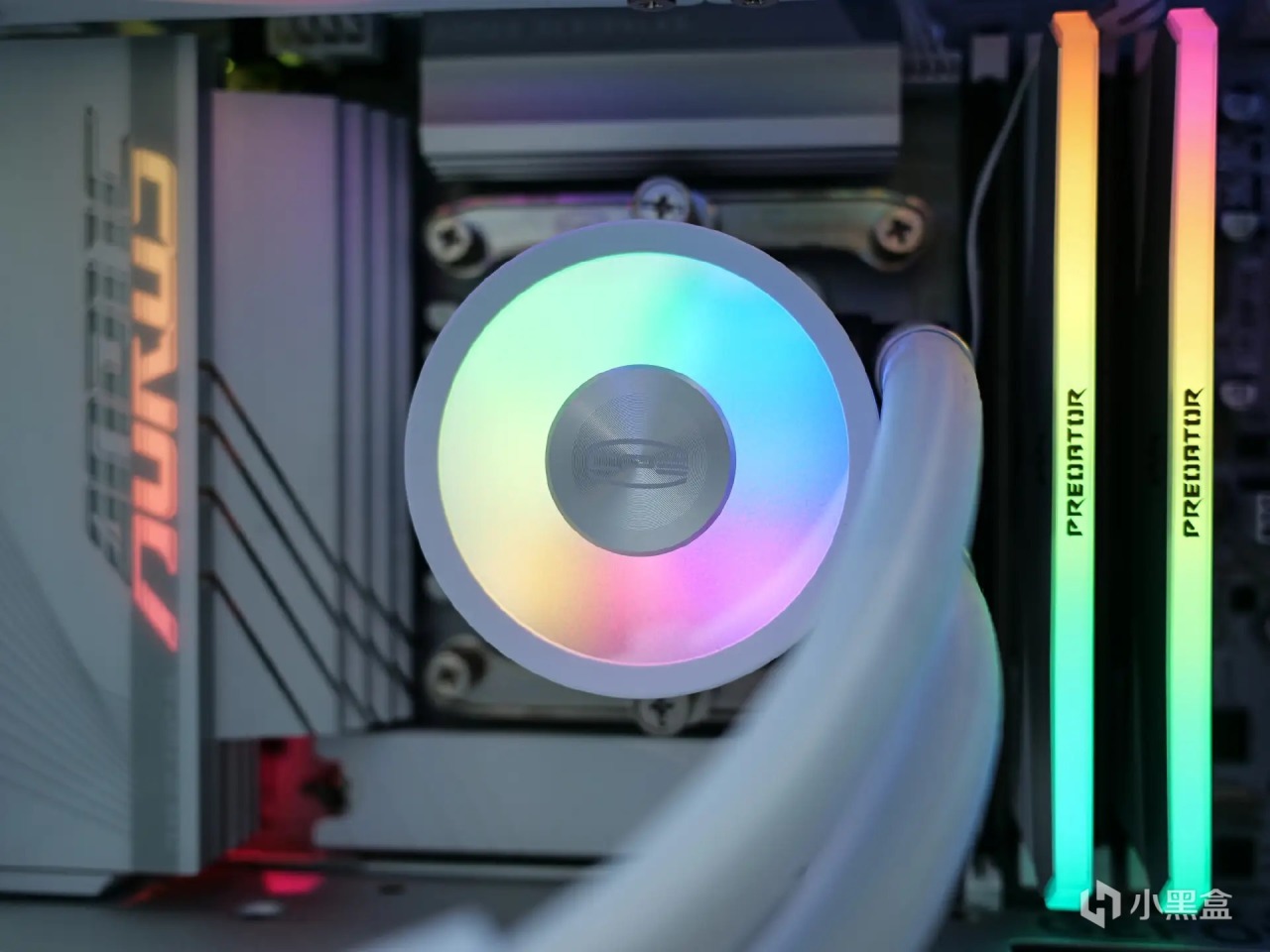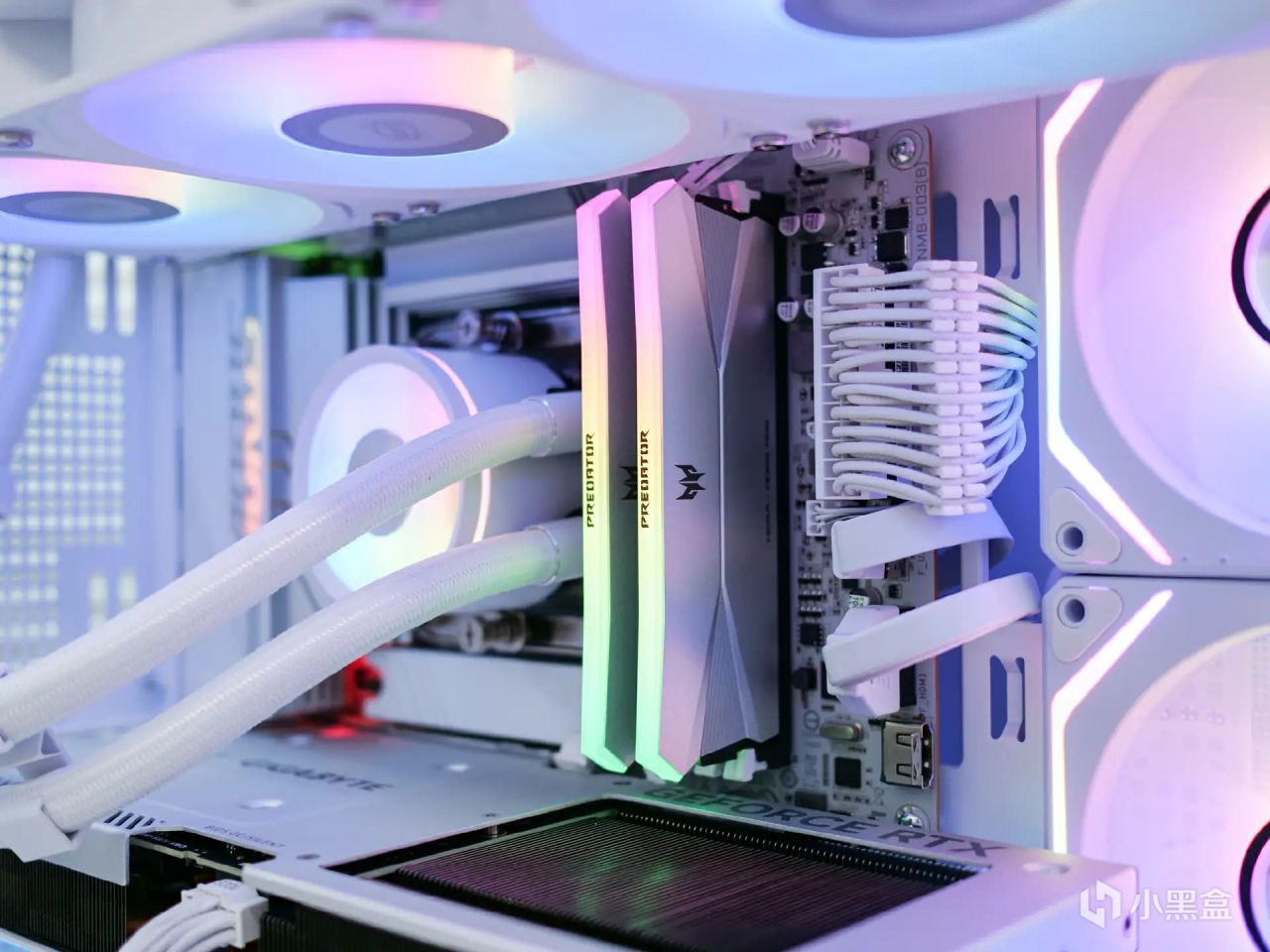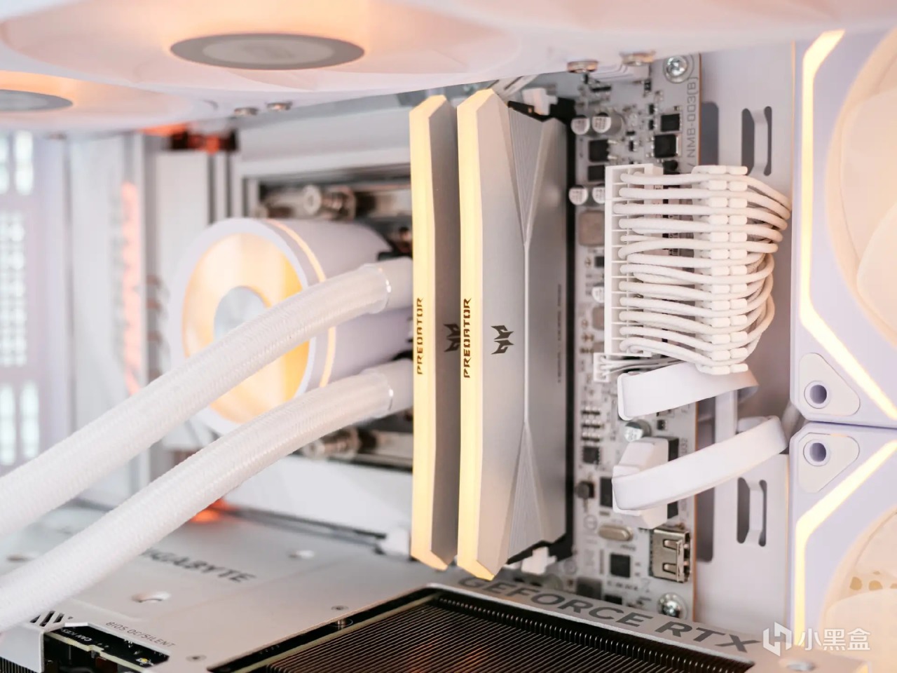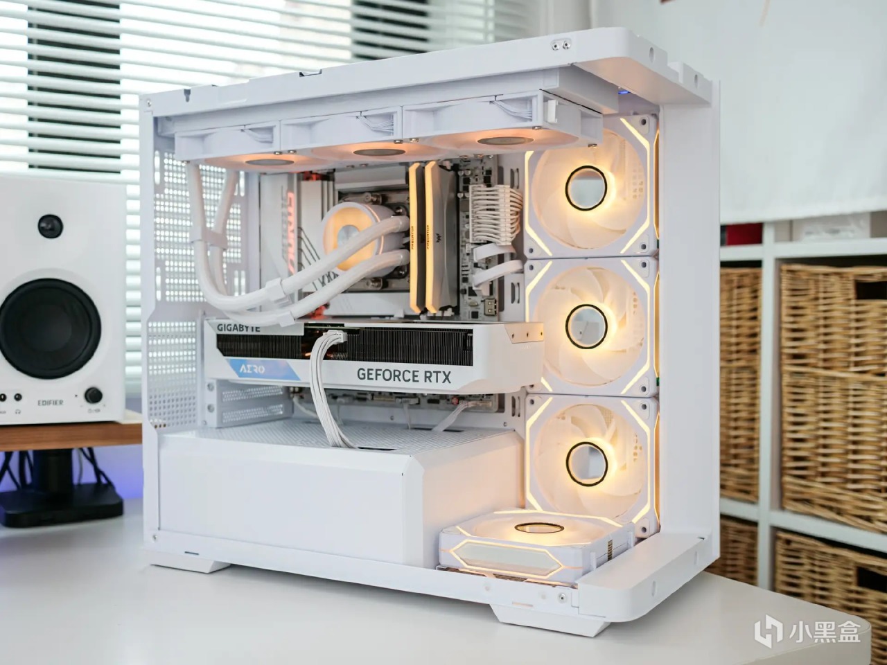 整機主打高性能純白高顏海景房,因此主板、顯卡、內存、水冷等能看到的裝機配件選擇都是白色,並且也選擇了支持ARGB燈效的積木風扇做裝飾,可以通過技嘉主板的GCC軟件進行燈光同步。