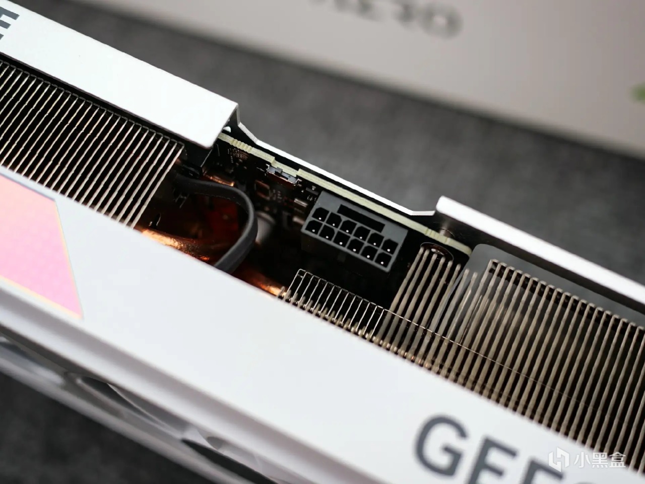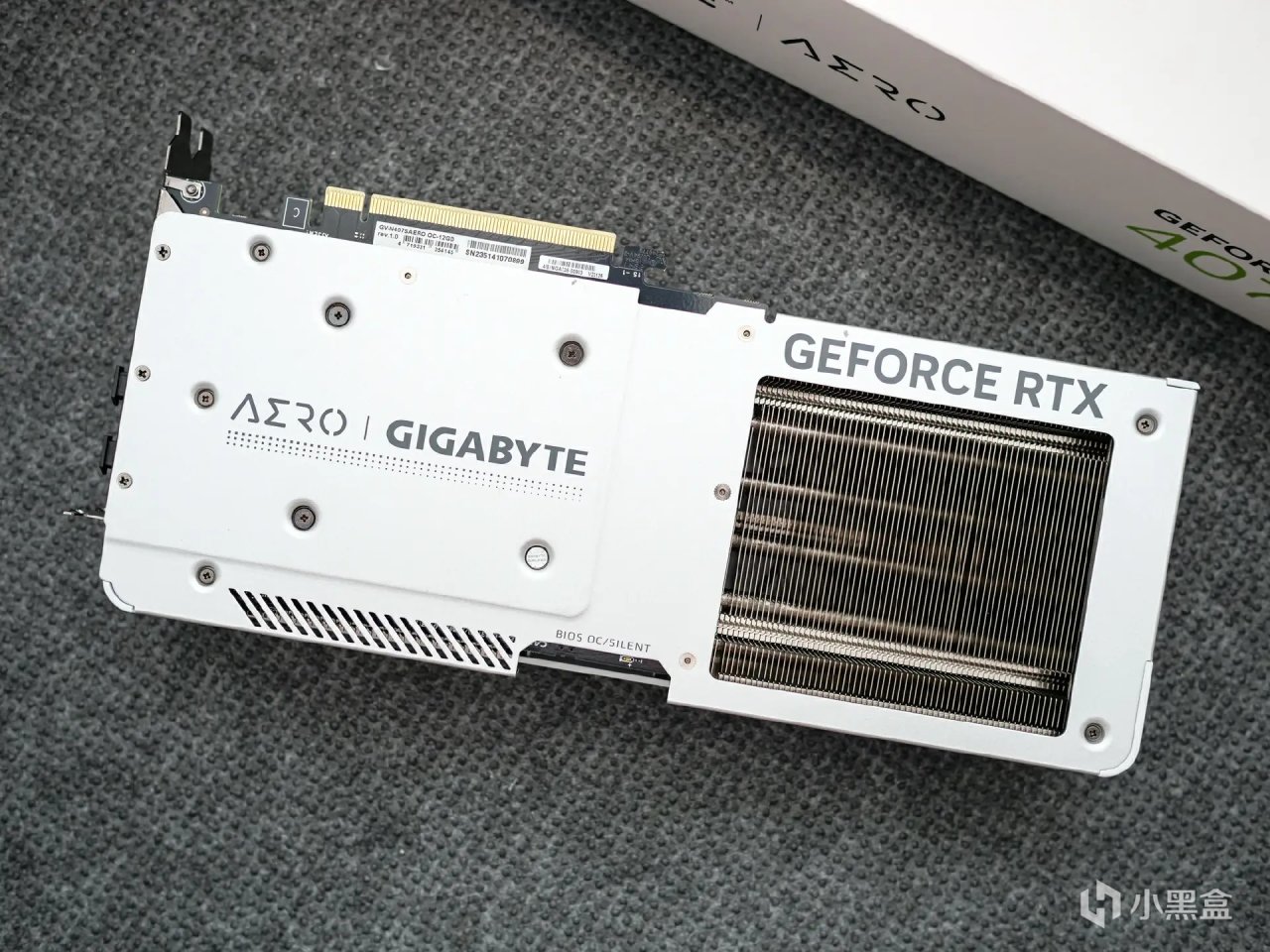 顯卡背部是銀色金屬背板,尾部預留有大面積的鏤空,通過鏤空可以看到裏面的散熱鰭片和複合式熱管。技嘉RTX 4070 SUPER AERO OC 12G的散熱採用了銅板和複合式熱管結合的設計,銅板直觸GPU和顯存核心,配上8根複合式熱管把熱量傳導到散熱鰭片上,導熱效率更高。