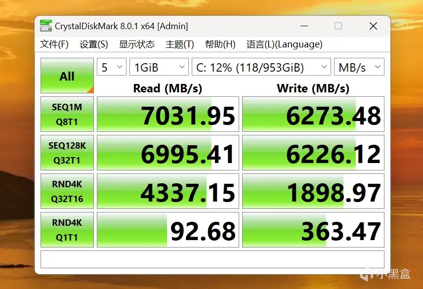 使用CrystalDiskMark進行硬盤讀寫速度測試,希捷酷魚530的持續讀取速度爲7031.95MB/s,順序寫入速度爲6273.48MB/s。由於是在intel平臺且用於系統盤,因此這裏讀取速度未能達到標定的7400MB/s屬於正常情況(Intel平臺上限7200MB/s左右),寫入速度則是超過了標定的6100MB/s。
