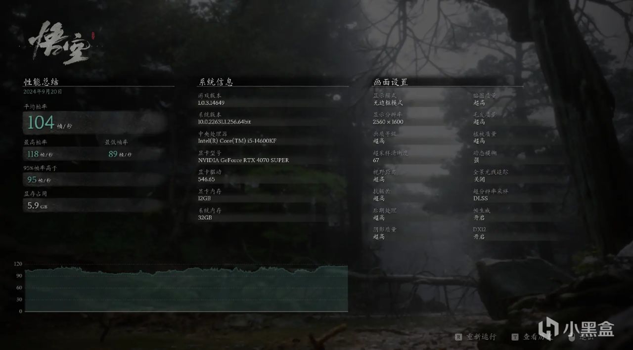 具體遊戲性能上,這裏用近期大熱的《黑神話·悟空》BENCHMARK測試工具跑了一下。在2K分辨率,超高畫質下,開啓DLSS超分辨率採樣和幀生成,平均幀率可以達到104FPS,最低幀率也有89FPS。