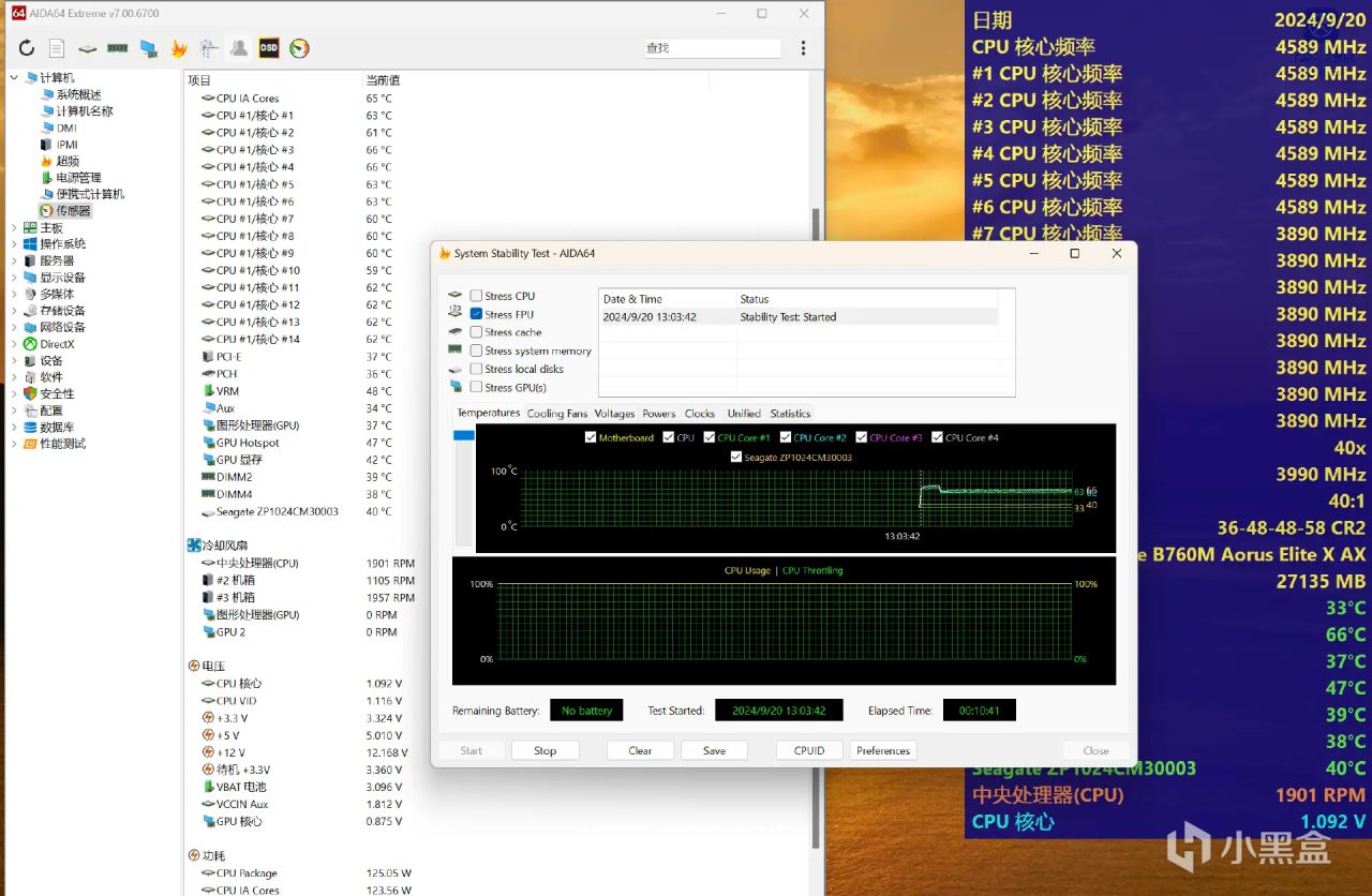 CPU散熱性能方面,使用AIDA64單烤FPU,10分鐘後14600KF滿載運行溫度只有66℃,不過這個是最新BIOS下Intel default setting設置功耗限制後。