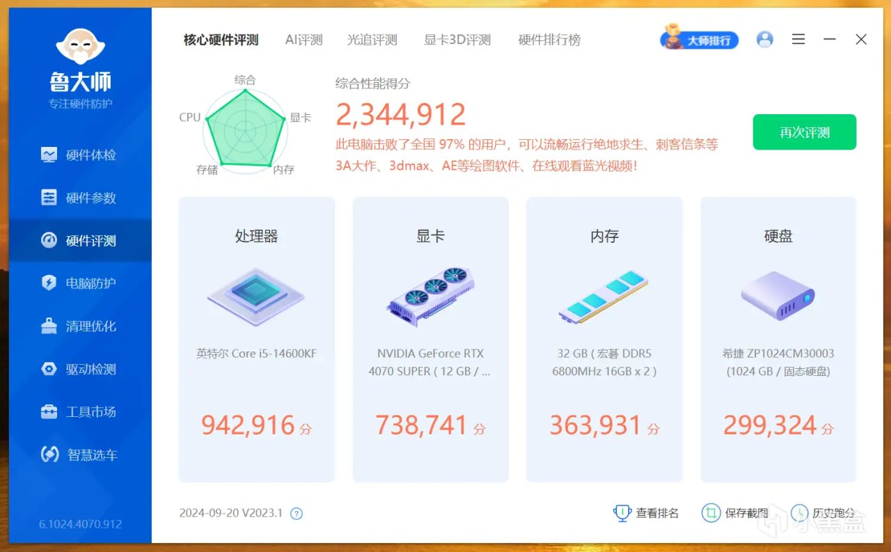 喜聞樂見魯大師跑分,總分234.4萬,其中CPU得分94.2萬分,顯卡得分73.8萬,內存得分36.3萬,硬盤得分29.9萬分,整機超過全國用戶97%用戶。