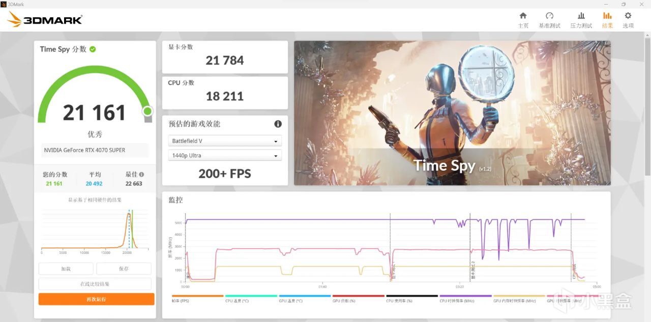 3DMARK Time Spy測試分數21161,CPU得分18211,顯卡得分21784,軟件模擬在1440P分辨率下游戲幀數超過200FPS。