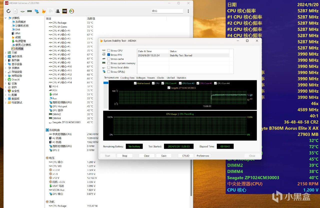 關閉Intel default setting設置後,i5-14600KF滿載功耗153W,同樣AIDA64單烤FPU測試,10分鐘後CPU溫度爲72℃,對於超頻三DA360 PRO來說一樣毫無壓力。