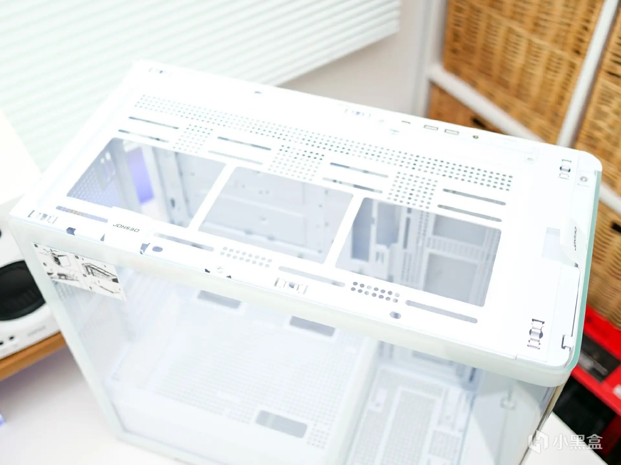 取下機箱頂部蓋板,可以頂部的冷排支架,喬思伯D300頂部支持360水冷安裝。另外2個帶有喬思伯標識的提手則用於拆卸側面熱彎玻璃。