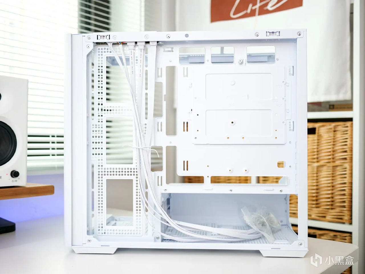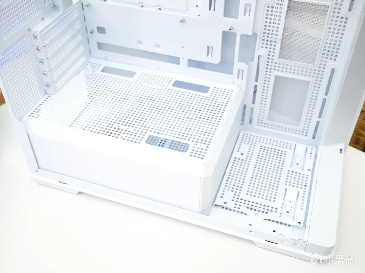 機箱內部空間,下置獨立的電源倉,靠近機箱前面位置做了分離,保障側前方可以安裝360水冷排或者3把120mm的風扇用於前進風。