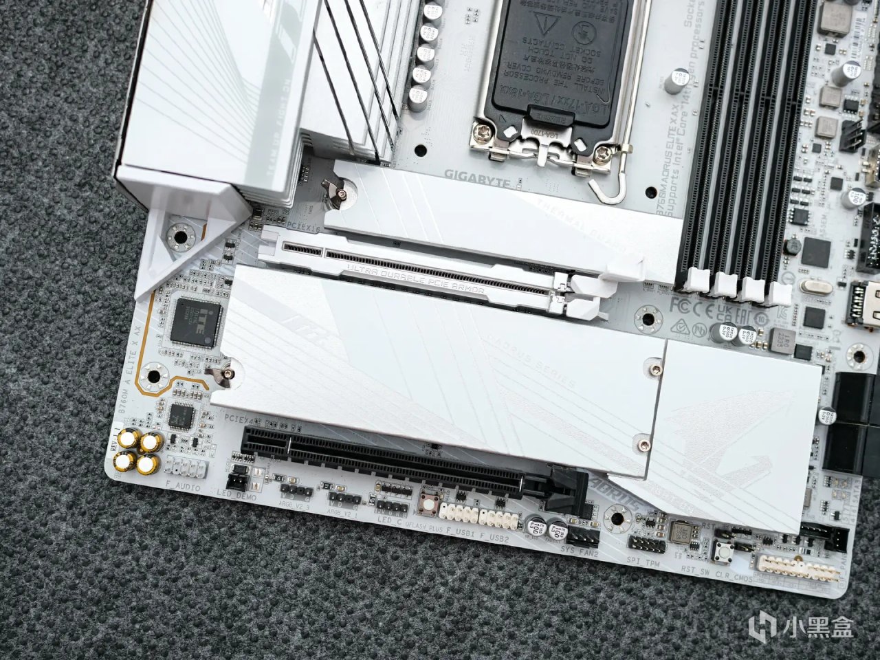 擴展方面,作爲一塊MATX主板,技嘉B760M冰雕X主板配有兩根全長PCIe X16插槽,靠近CPU的是PCIe 5.0 X 16速率,同時採用了UD Slot X設計,鋅合金材質框架加固,加上橡膠內襯,耐用性大大增強。
