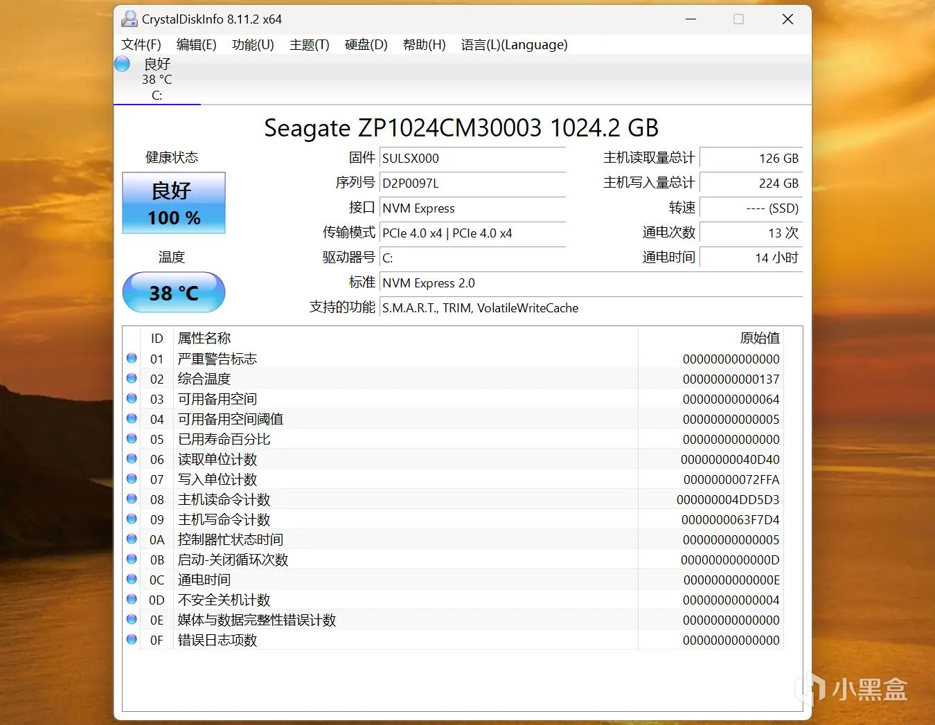 先用CrystalDiskInfo查看一下希捷酷魚530的SMART信息:硬盤總容量1024.2GB,傳輸模式PCIe 4.0 x 4,協議標準爲NVM Express 2.0,室內溫度27℃,使用主板自帶M.2固態硬盤散熱裝甲硬盤待機溫度38℃。
