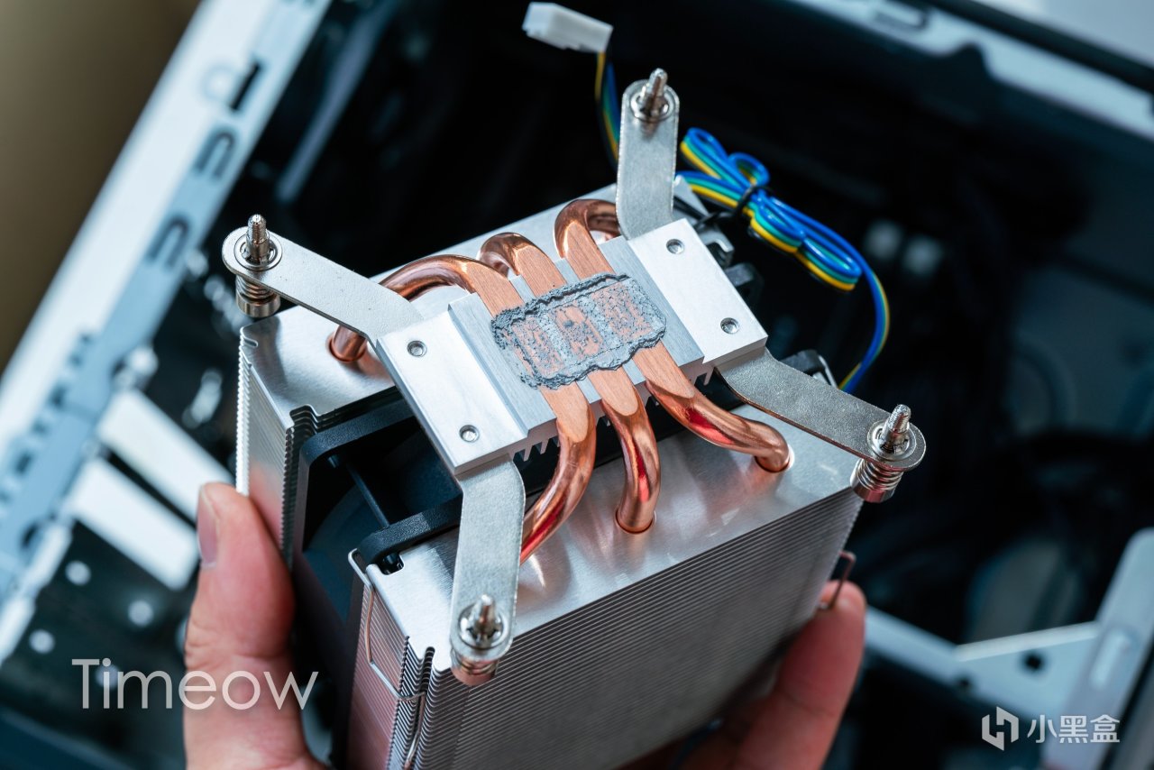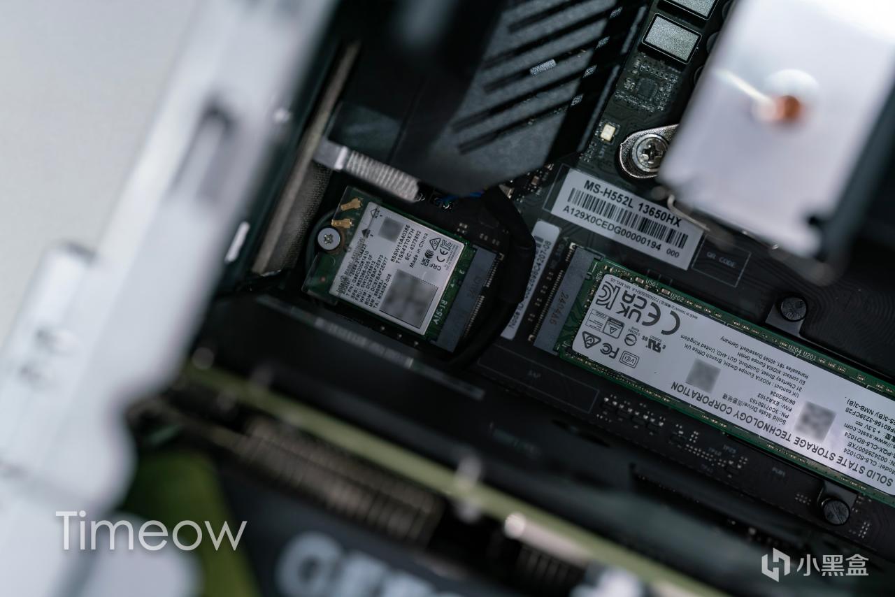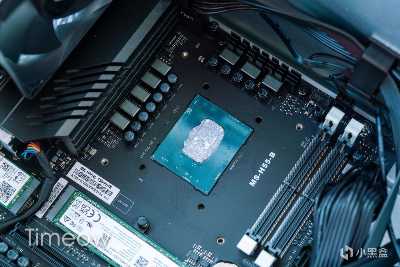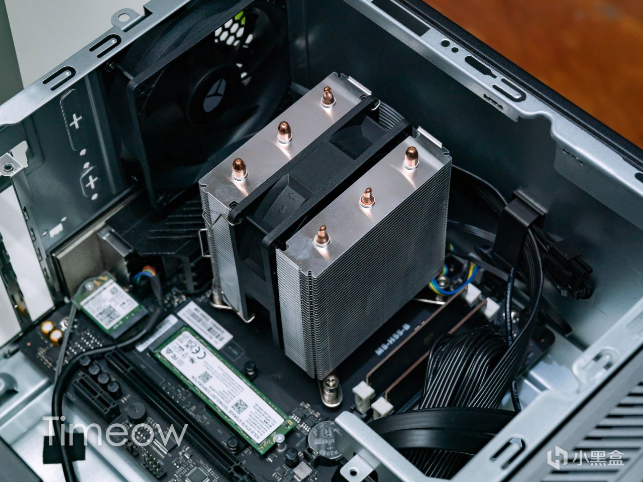 拆下机械硬盘托架后,可见散热器的全貌,双塔+90mm风扇,以及一个90mm的机箱风扇,应对13650HX的日常运行倒是轻轻松松,甚至可以说“毫无噪音”。现在CPU满载95W,温度可达98摄氏度,但稳定不掉电压。