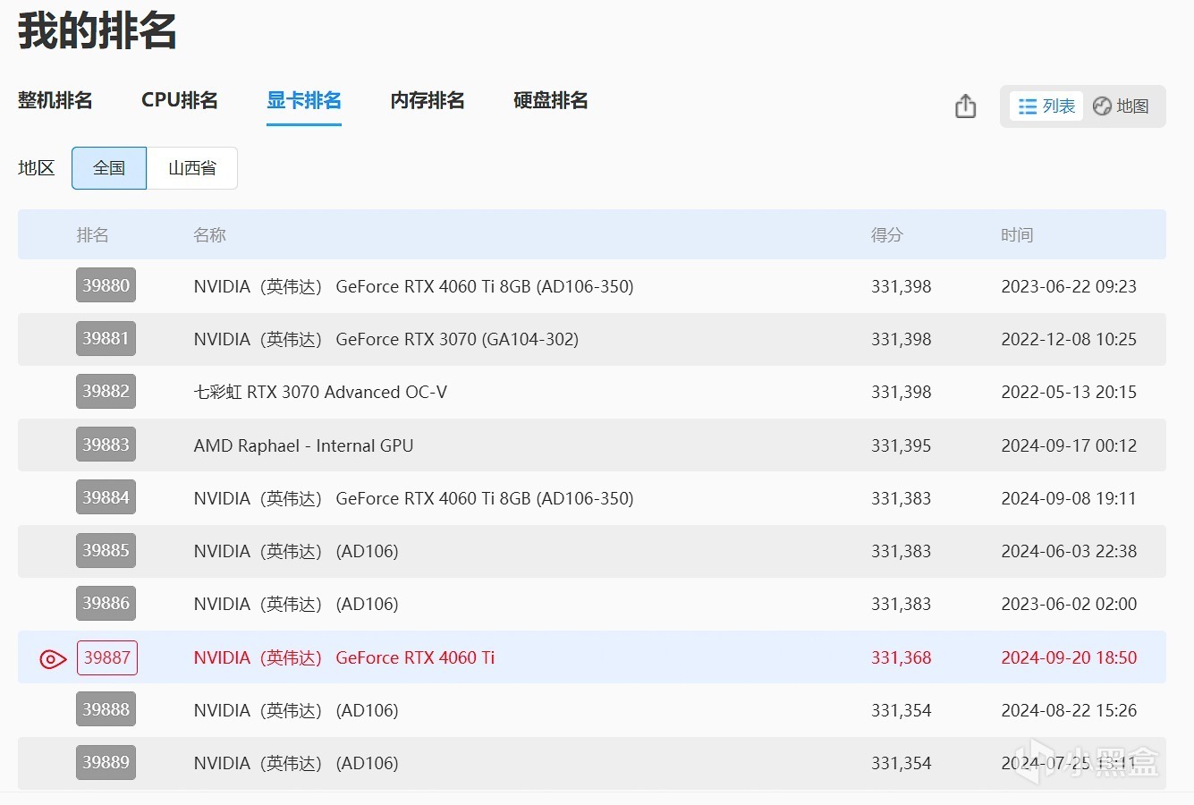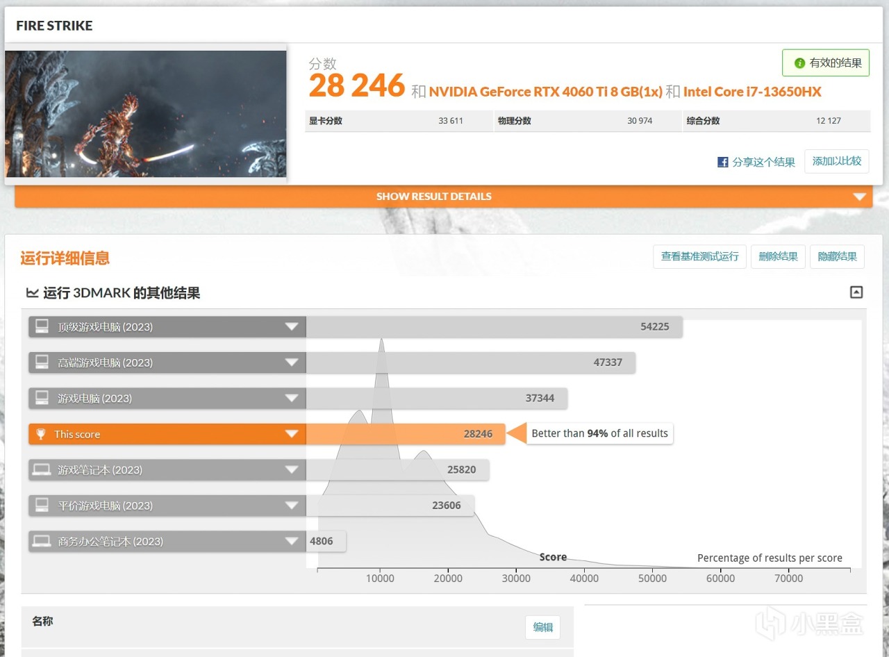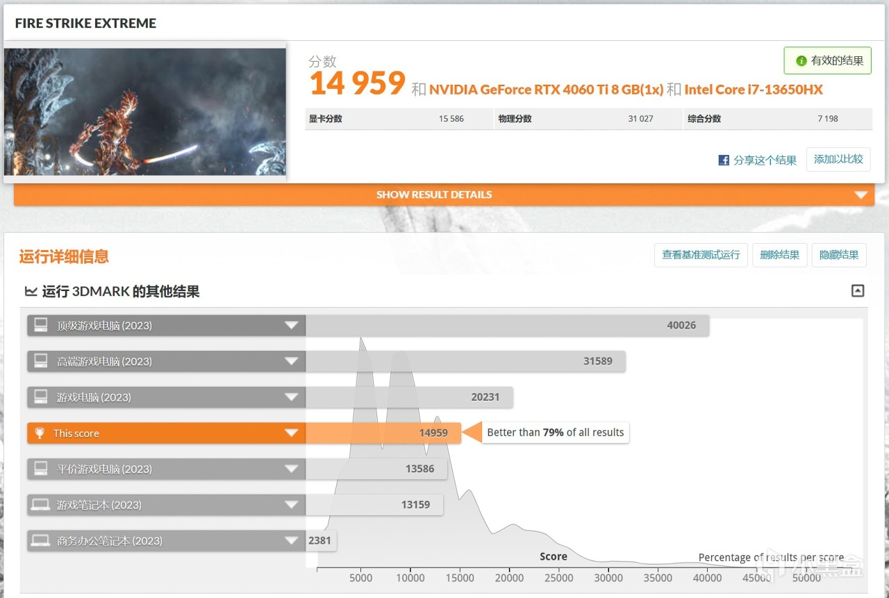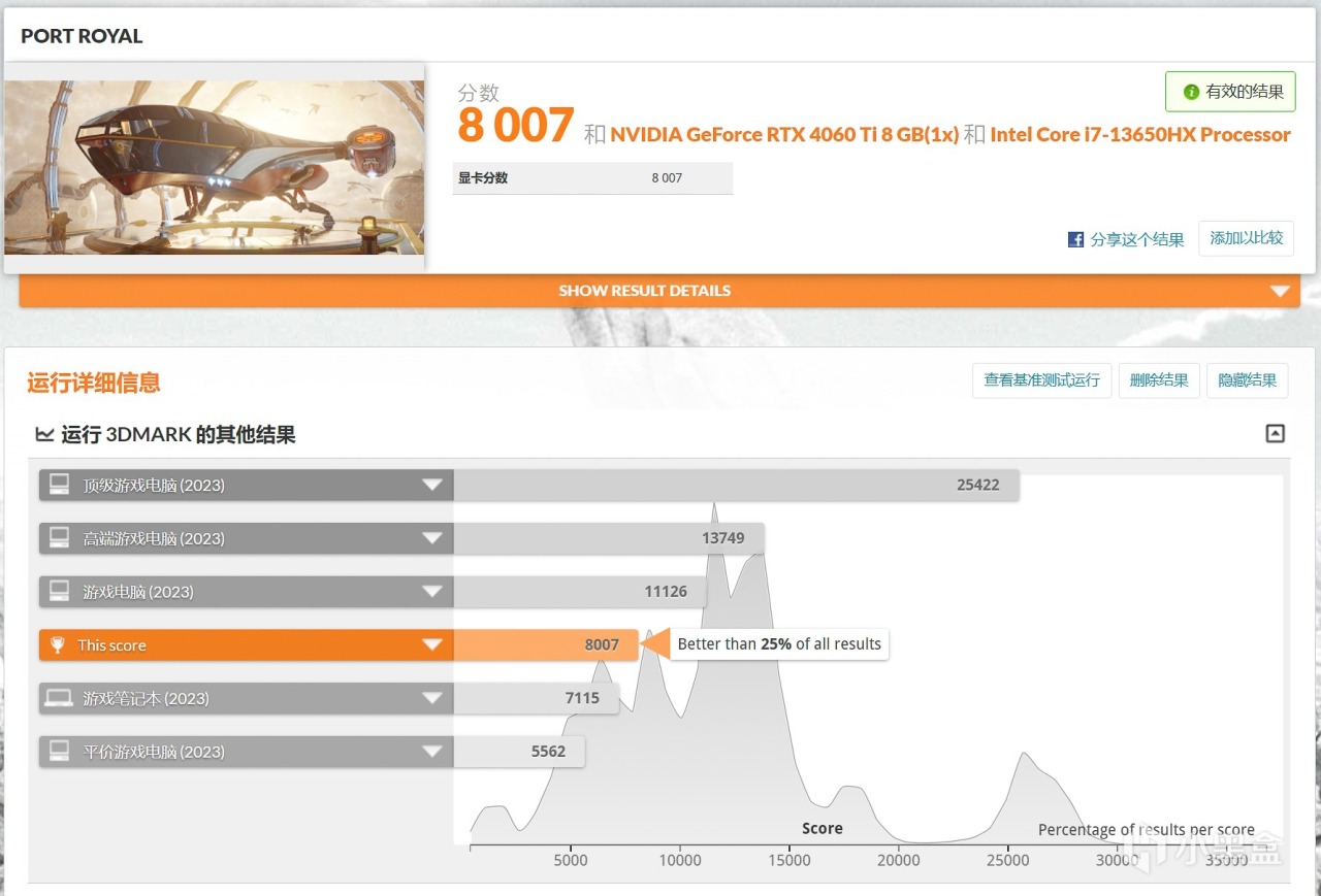 雷神黑武士·猎刃的4060Ti得分8007,好于25%的测试机器。