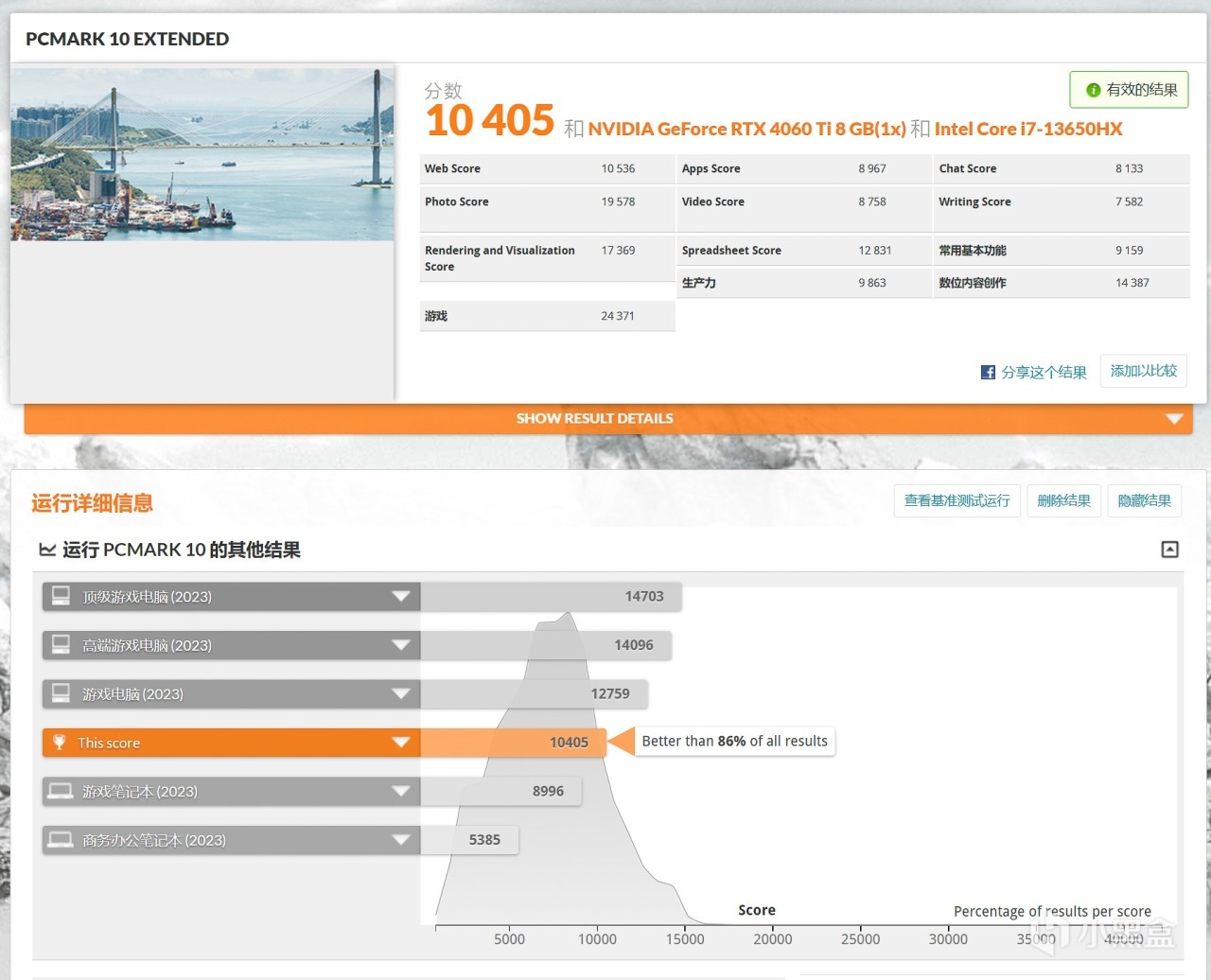PCMARK 10 Extended耗时约30分钟,测试的是整机的生产力性能和稳定性,搭载13650HX的雷神黑武士·猎刃得分为10405分。在PCMARK 10的在线结果评比中,这个成绩超越了86%的测试机器,高端商务办公笔记本(i7-1360P处理器)得分只有它的一半。
