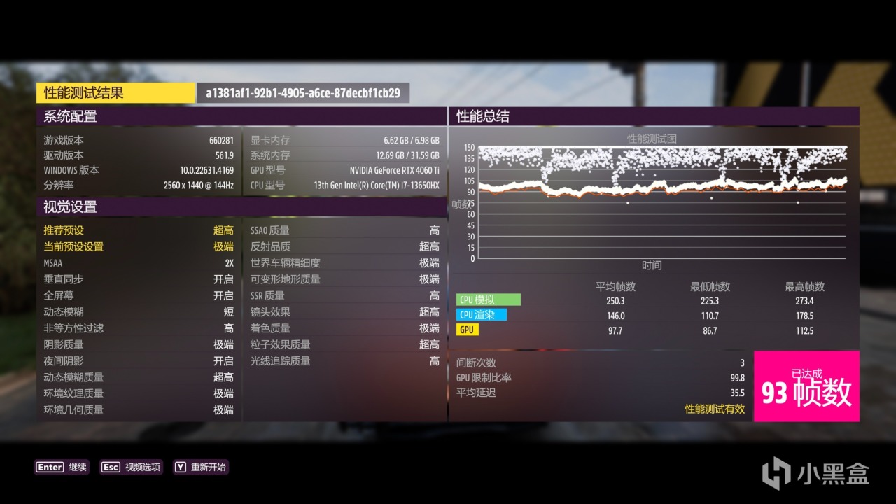 2K分辨率下,我们直接拉满:预设的极端画质,关闭FSR/DLSS等AI功能、开启2x MSAA和垂直同步的情况下,在游戏内的benchmark内,雷神黑武士·猎刃跑出平均帧数97.7的成绩。这样的数据其实已经非常顶了。