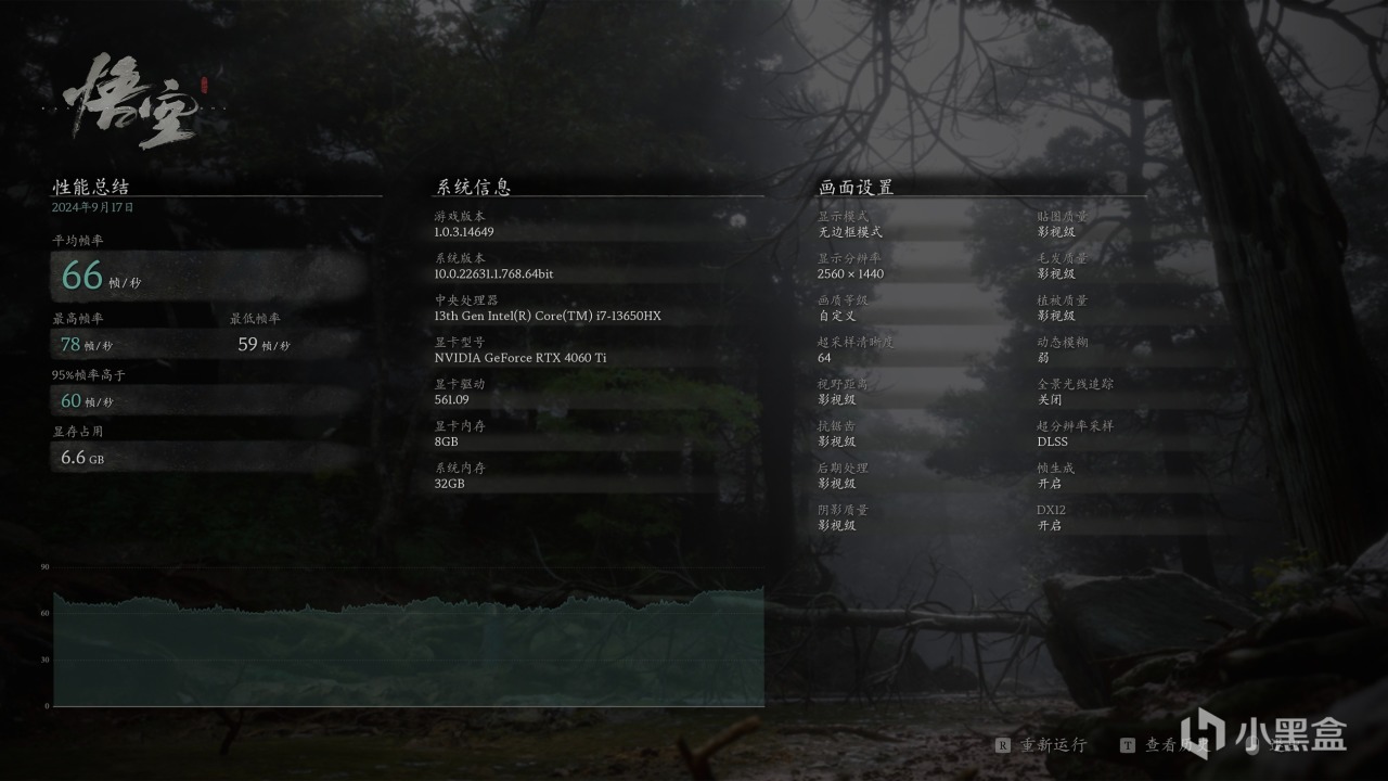2K分辨率+最高影视级画质下,超采64,开启帧生成后,帧数为66帧、最低帧59,非常流畅且无卡顿。另外,N卡的帧生成延迟很小,玩起来体验非常完美。