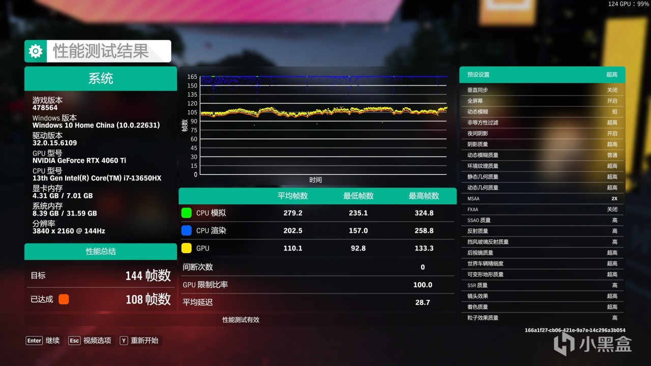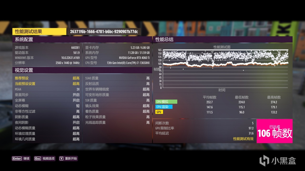 如果稍稍将画质降低一档,开启超高预设,雷神黑武士·猎刃跑出的平均帧数为111.5!