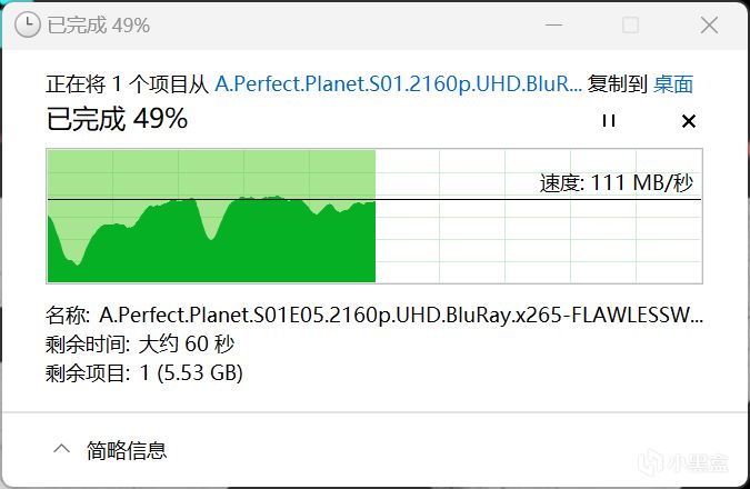 而在内网里,隔着一堵墙的情况下,在NAS上下载一个视频文件,速度能达到110-120MB/s,表现相当可以!