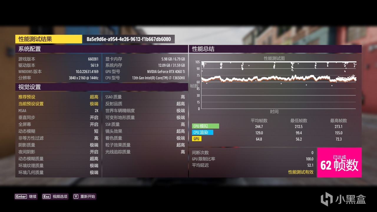 2K分辨率+预设超级方案,游戏自带的benchmark测试中,雷神黑武士·猎刃平均帧数72.42,最低帧62.16。