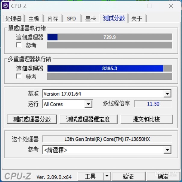 在CPU-Z中,单核跑分729,多核跑分8395。这个分数达到了2024桌面旗舰处理器i9-14900K的50%以上,表现极为亮眼啊。